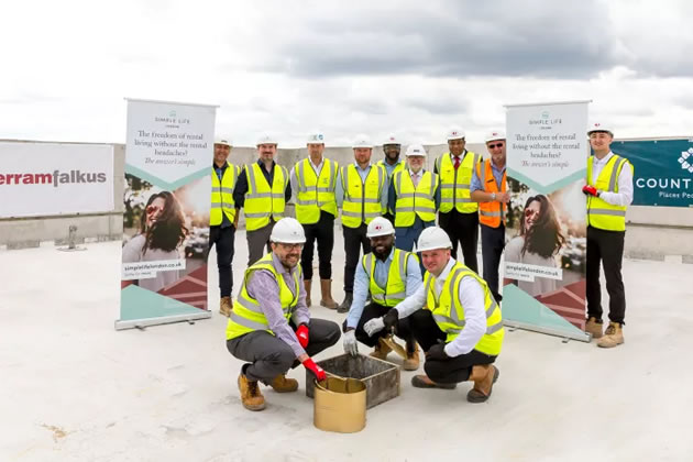 The topping out ceremony was attended by key figures and stakeholders of the development including Simple Life London representatives, Stuart Churchward and Steven Brewster, as well as Jamie Wilding and Andrew Watson from Countryside.