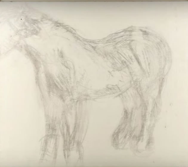 Sketch of Goldie in charcoal on canvas, is a ‘study’ of a horse that Freud left incomplete in 2003. He embarked on the work at the Wormwood Scrubs Pony Centre in West London, which is run by the nun, Sister Mary-Joy Langdon. He had been introduced to the stables by his studio assistant, the artist David Dawson, who had chanced on them while walking his dogs on the Scrubs. Very few of his canvases have remained unknown, making this work particularly rare.