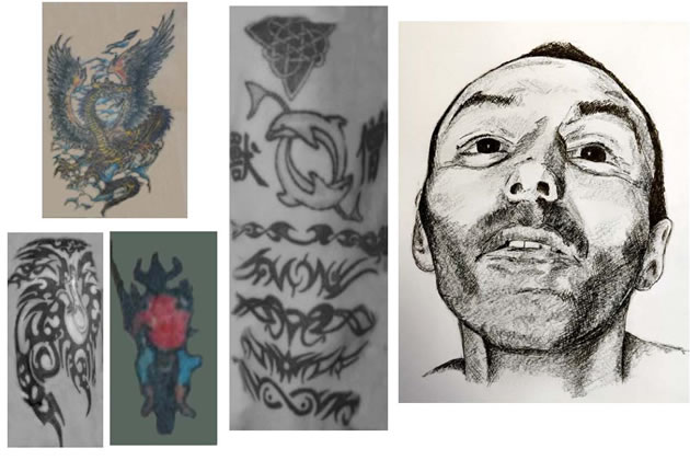 Images of the man's tattoos and an artist's impression of his likeness. Picture: BTP
