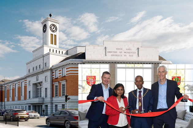 Acton Old Town Hall on the High Street. Inset: Rupa Huq MP celebrates the completion of the Acton Town Hall redevelopment in 2019 with Mike Johnson (Group Director of Development, One Housing), Cllr Dr Abdullah Gulaid, Mayor of Ealing and Richard Hill (Chief Executive, One Housing)