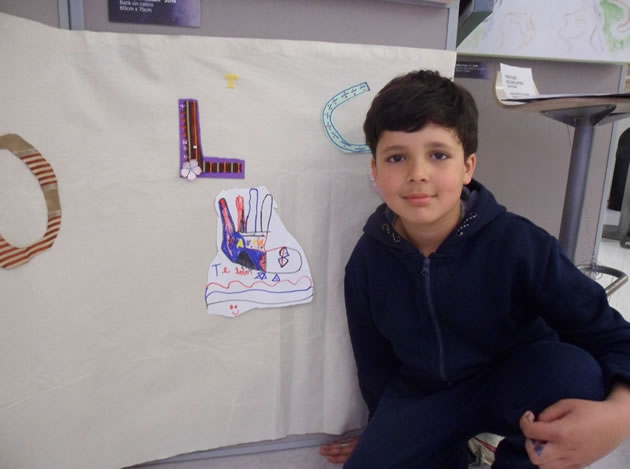 Tarik Eulabid, eight, shows off his work at the exhbition