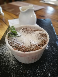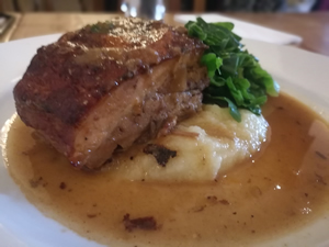 My virtuous companion who always dines lightly at lunchtime had to be forcefully persuaded, in the interests of giving fair coverage to the fine meat dishes on offer, to go for the Pan Roast Pork Belly with rosemary mashed potatoes, curly kale and apple and brandy gravy (£12). His protests stopped with the first mouthful. The combination of flavours and the portion size was perfect, the meat uncharacteristically tender and the crackling crisped on the outside, succulent within. I shall just add that the man who was worried about huge helpings sent back a clean plate.