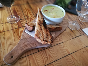 We mixed and matched amongst the three of us to try to give as wide as possible an impression of the choices on offer. Soup of the day was an astonishing meal in itself for just £5.00 and very possibly my favourite dish of the entire banquet, difficult though it is to pick a winner. Pea, ham and mint with, floating within it, a whole poached egg, served with crisply warmed sourdough bread, it had a richness of flavour that almost defies description. I loved how Stefano had taken a summer staple – pea and mint – and given it a warming winter twist. Perfect for a chilly ‘spring' day as the snow fell!