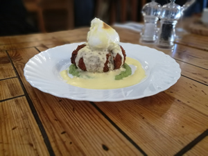 The flair remained consistent with the Salmon and Smoked Haddock Fishcake (starter size £5/main £9) with Hollandaise sauce, poached egg and a pea purée. This was a textbook example of how to elevate a dish too often reduced to a bland, potato-heavy disappointment to fishy heaven on a plate. We probed Stefano as to the hidden secret of that extra kick of flavour and discovered it was good old English mustard: along with horseradish, a brilliant complement to Hollandaise sauce.