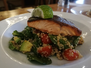 As it turned out, the Pan Fried Salmon Fillet with quinoa, baby spinach, avocado, pumpkin seeds and pomegranate dressing (£12) proved more of a lunchtime challenge, just for the sheer generosity of the portion. A chunky, succulent fillet, skin lightly crisped, set atop a colourful and nicely textured salad bed – first class.