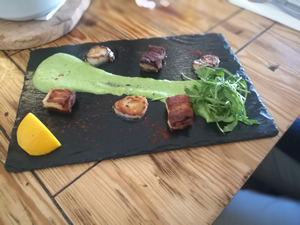 Scallops are one of those deceptively simple dishes that the inexperienced cook (me) can mess up in seconds, either from a failure to choose the best fresh ingredients or the cardinal sin of overcooking. Naturally, no such horrors occurred here and, for presentation, this was dish of the match. Served on a slate with an artistic slash of vibrantly-coloured cauliflower and spinach purée, the Pan Fried Scallops with pork belly looked like little gems displayed on a jeweller's shelf. Texture and taste combination bang on.