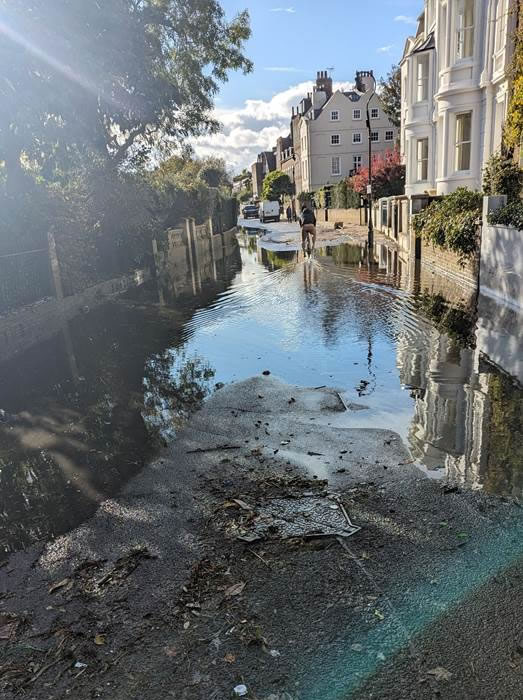 During the week (in case you didn’t notice) there’s been quite a bit of rain. This has led to some flooding (everybody says it’s because the grids are blocked: occasionally true but the real problem is too much water for the drains to cope with) and in particular in Chiswick Mall where there has been an additional problem with failure of the river wall. I believe this is OK now but on Tuesday it looked like this so joint work from Hounslow Highways and Thames Water was needed to get it fixed.