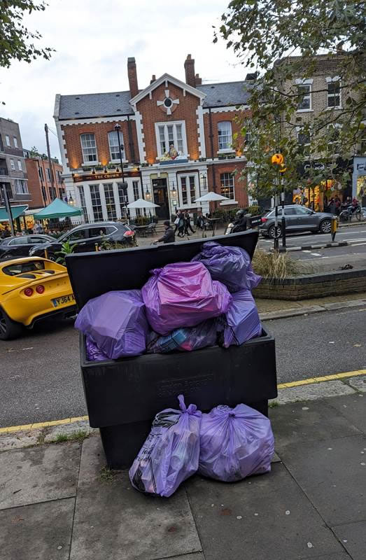 Over the weekend I cycled down to Hammersmith and back through Chiswick. One of the changes we’ve made over the last couple of years have been to try and eliminate purple bags used for waste disposal for those who live in flats above shops by providing ‘grit bins’. Mostly this works well but sometimes there is not enough capacity. Like here!