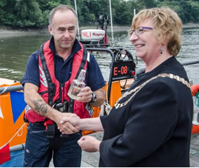 On Thursday (4 September) Chiswick RNLI lifeboat crew collected the bottle from Kew where it had spent the night at the London Museum of Water and Steam and delivered it to Chiswick Pier, where it was received by the Mayor of Hounslow, councillor Corinna Smart.