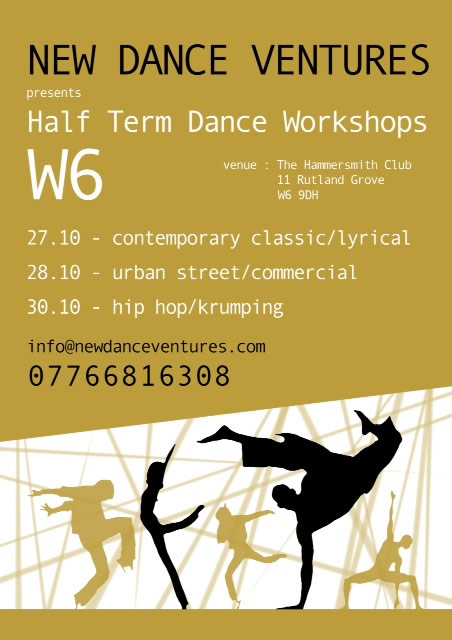 New Dance Ventures launches this half term with 3 days of dance workshops in Contemporary, Street & Hip Hop, perfect for beginners or more experienced dancers aged 10-12 yrs. Try a new style, improve technique and performance skills. Sessions 11-3pm Monday 27, Tuesday 28, Thursday 29. Bring a packed lunch. Performance/ sharing from 2pm for parents/carers. All teachers DBS checked. Venue: The Hammersmith Club 11 Rutland Grove W6 9DH.