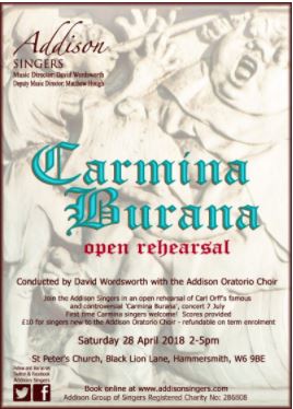The cost will be £10 to singers not already enrolled with the Addison Oratorio Choir for the Summer term, but refundable to new singers who enrol online with the Oratorio Choir by Friday 4 May– enrolment advice will be available at the Open Rehearsal.