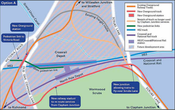 Option A - A viaduct will divert the current Clapham Junction to Stratford line so that it links with the Richmond line at the new station at Old Oak Commmon. As in all the other options, a walkway will link the Overground station with Crossrail and HS2 stations.