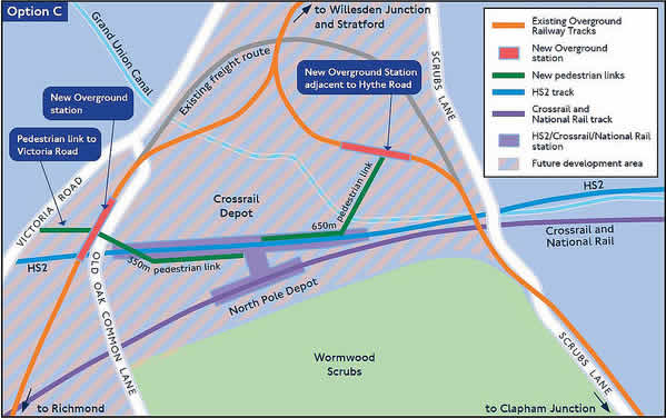 Option C - Clapham Junction line is not diverted to link up with Richmond line at Old Oak. Instead, two new stations are built, one at Old Oak and one next to Hythe Road, both linked by walkways to the Crossrail and HS2 stations at Old Oak.