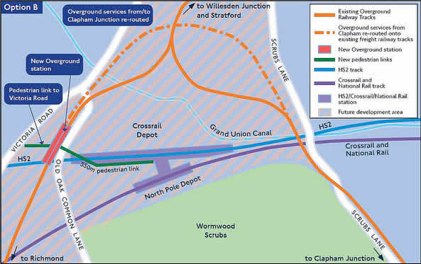 Option B - Clapham Junction services are diverted along existing freight railway tracks towards Old Oak Common station. A short walkway links Overground, Crossrail and HS2 stations.