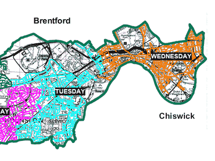Rubbish in Chiswick will now be collected on Wednesdays and Brentford collections will be either on Tuesday or Wednesday. Note these changes do not apply to you if you live in Ealing Borough.