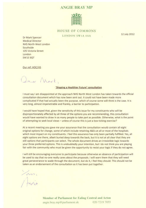She has written to NHS North West London Medical Director, Dr Mark Spencer (reproduced with permission below)