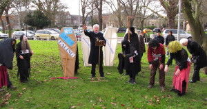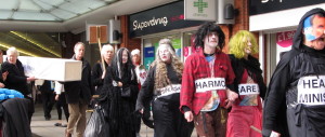 In the street theatre - Government Health Secretary Jeremy (Count Dracula) Hunt MP emerges from a coffin and proceeds to auction off NHS services to the private sector for ‘buttons’. But it all ends well as the Funeral Vicar forces the private sector vampires and zombies to give back to the NHS the services they were ‘gifted’ and he sorts out Dracula Hunt by driving a pointed crucifix through his heart.