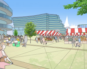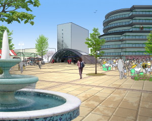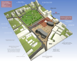 So we need a station that is gateway to our Borough, something so spectacular and welcoming that it would attract the very people we need – businessmen, entrepreneurs, artists, residents who are happy to arrive and not flee in panic. All great urban centres, moreover, are built around a piazza. We came up with a scheme (as the illustration shows) in which the new station opens onto a piazza which would occupy the whole of the present Arcadia site. In the piazza we find a new hotel (desperately needed); a multiplex digital cinema (desperately needed); a conference centre (desperately needed); an arts centre with concert hall and/or performance area (desperately needed); extensive underground parking (desperately needed); a transport hub for buses & taxis (desperately needed); traffic re-routed and banished from the centre (desperately needed). You’ll find all of the above in every major urban centre throughout Europe. But not here.