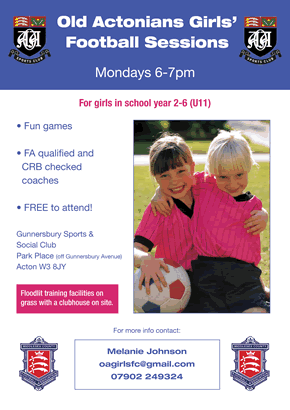 Local girls have the opportunity to play football with the start of training sessions Monday 5th November at Gunnersbury Sports & Social Club, Park Place, Acton, W3, 8JY (formerly London Transport Ground) .