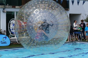 all gave their support to the fund-raiser and took part in a unique 'zorb' tea-party - enjoying tea and cake inside a huge plastic ball which was launched before an enthusiastic audience onto the swimming pool.