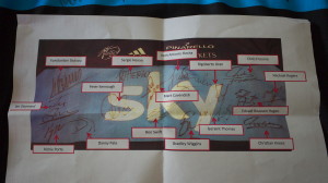 The Team Sky jersey is one of 6 similar tops that has been signed by the full Team Sky team. It is a men’s UK size medium in black, white and turquoise with short sleeves, two rear pockets, elasticated waist and front zip. The top carries the team branding, has never been worn and comes with a certificate of authenticity from Sky – the perfect Christmas present for the cycling fanatic.