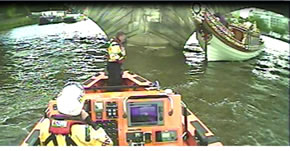 "While discussing with the skipper the best way to extricate her, Gloriana came free and was blown by the gusting winds to the other side of the span. The lifeboat attempted to get between the casualty and the arch to prevent her from getting jammed again but couldn't get there in time. Once on her starboard side a line was rigged which enabled the lifeboat to pull Gloriana through the bridge to the upstream side. Once in safe water an alongside tow was rigged and she was taken back through the bridge and berthed alongside Kew Pier".