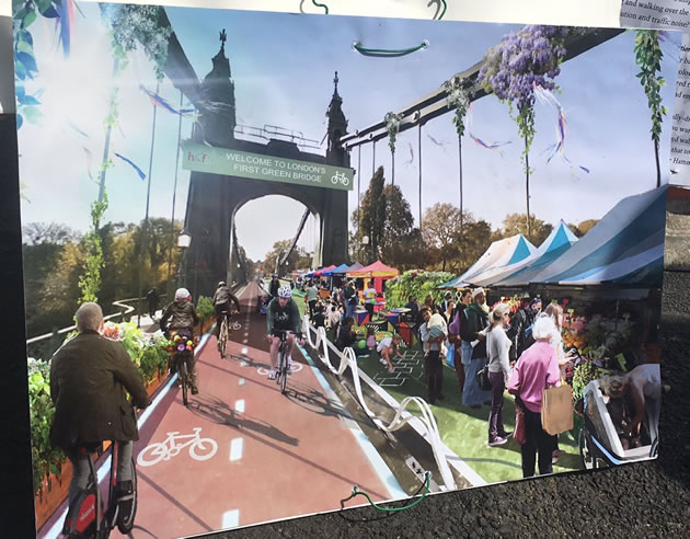 The local activists invited people using the bridge to imagine it would be like in a car free future with it perhaps becoming London’s first garden bridge. They held a poll asking what modes of transport the bridge should be open to and said that there were lots of constructive conversations with residents of Hammersmith and Barnes.