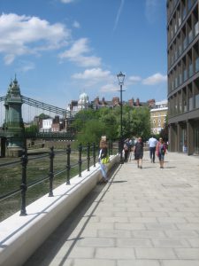 The building provides a well-mannered backdrop to Hammersmith Bridge that offers a successful composition of the riverside elevation. The River Walk, a wonderful wide promenade that was a planning condition required by the London Borough of Hammersmith and Fulham without which it would not have been realised, is integral to the success of the Queen’s Wharf building and is a great example of successful town planning.