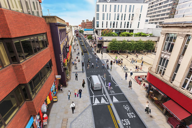 New segregated two-way cycle track mostly on the southern side of King Street, with footway and carriageway narrowing in some places
