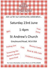 Community celebration at St Andrew's Church in Greyhound Road, W14 on Saturday 23 June from 1pm - 4pm.