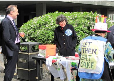" The Save Our Hospitals group arranged an afternoon birthday celebration outside the main entrance, next to the Henry Moore statue, with balloons, birthday cakes, brownies, cupcakes, savoury snacks and other delicacies which were sold to the public.