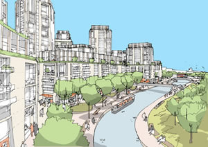 It will have schools, parks and a new canal-side environment, with a waterside public square called Grand Union Square and cultural quarter which looks set to be anchored by a huge new building established by the Science Museum.
