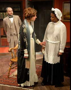 While all this is going on, the invisible thing begins to make its presence known with hilarious, almost slapstick consequences. Meanwhile, Lucy's maid Mrs Rochester (Faith Edwards), sullen and monosyllabic, drifts in and out with tea and whisky. She's the quiet one and those are the ones you've got to watch.