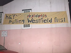 A protest banner hanging across one of the houses in Shepherd’s Bush Place shows the H&F logo changed from “Putting Residents First” to “Putting Westfield First”. The banner went up in time for the shopping centre opening last Thursday (30 October).