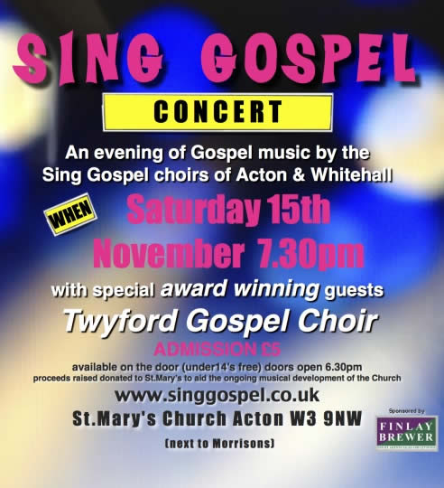 Sing Gospel present their 4th annual evening of Gospel music by the Acton Sing Gospel Choir and the Whitehall Sing Gospel Choir at St. Maryʼs Church, 1 The Mount, Acton High Street, London W3 9NW (Next to Morrisons), on Saturday 15th November 2014 at 7.30pm (doors 6:30pm)