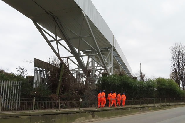 HS2 workers on the pavement beneath the bridge. Picture: David Hawgood