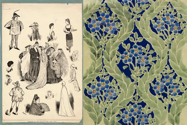 Fancy Dress Ball at the Bedford Park Club, Chiswick, London, from the Illustrated Sporting and Dramatic News, 17 July 1880. Engraving by John Jellicoe(left) Wallpaper design designs for textile or wallpaper c1905 by George Charles Haité, an early resident. ©Victoria and Albert (right)