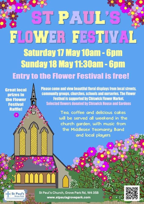 St. Paul's Church, Grove Park is holding a Flower Festival over the weekend of 17th and 18th May. This is a real community event and they will be welcoming contributors, including - St. Michael's Church, Sutton Court; Grove Park Group; Chiswick Horticulture and Allotment Society; Refugee Welcome Hounslow; Pot Pourri; Grove Park Road; Waldeck Road, Wilmington Avenue as well as Toddlers World and Strand on the Green School. Chiswick House and Gardens is kindly supplying some flowers and foliage from their gardens for a display and Chiswick Flower Market is supporting with a generous Raffle prize. There will be live music from local musicians in the Church and the Middlesex Yeomanry Band in the Garden on Sunday afternoon as well as refreshments all day and a raffle with some wonderful prizes.