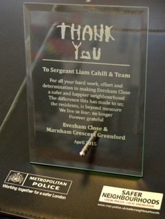 The plaque was engraved with the citation, 'Thank you to Sergeant Liam Cahill and Team for all of your hard work, effort and determination, in making Evesham Close a safer and happier neighbourhood. The difference this has made to us, the residents is beyond measure. We live in fear no longer. Forever grateful - Evesham Close and Marnham Crescent Greenford April 2015.'