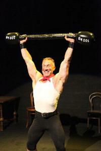 One of the funniest scenes was Fleaman’s fleas’ accidental drowning: Jolyon Houghton’s exaggerated mouth to mouth medical efforts was followed by a tragically funny burial. The clown, played by Jessy Moat, did tumbles, running jumps and headstands to make her character’s heavy-hat gag work and it was worth the effort.