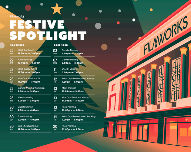 With exciting new openings and a warm festive welcome, Filmworks is here to help the community make the most of the season. Whether you are joining a workshop, visiting the cinema or simply taking in the Christmas buzz, there is something for everyone to enjoy.