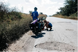 The photo of us sitting outside the shop. It was the end of the 150km day we did through elephant and lion territory, dehydrated and exhausted but still alive!