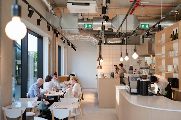 A contemporary and unfussy space, Rottura’s simple colour palette of white and bleached wood makes for a light and airy space. A mix of refectory and individual tables create a convivial atmosphere and window lined walls ensure there is plenty of opportunity to enjoy the hustle and bustle of the street (and river) beyond.