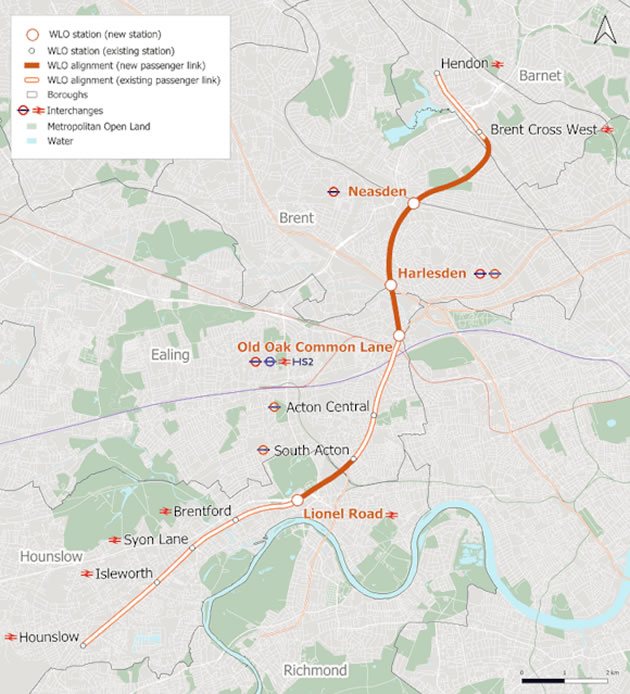 The West London Orbital would create a new London Overground route linking Hendon and Hounslow by reopening under-used freight lines to passenger services. Trains would run up to six times an hour, connecting major centres including Old Oak Common, Acton, Brentford and Hounslow, and offering ten new interchange opportunities with the Underground, Overground, Elizabeth line, National Rail and HS2. Four new stations are planned at Old Oak Common Lane, Neasden, Harlesden and Lionel Road, with alterations proposed at several existing stations along the route.