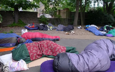 The group of people, including ten teenagers, 'slept rough' in the gardens of Holy Trinity Church and the Polka Theatre in The Broadway, Wimbledon.